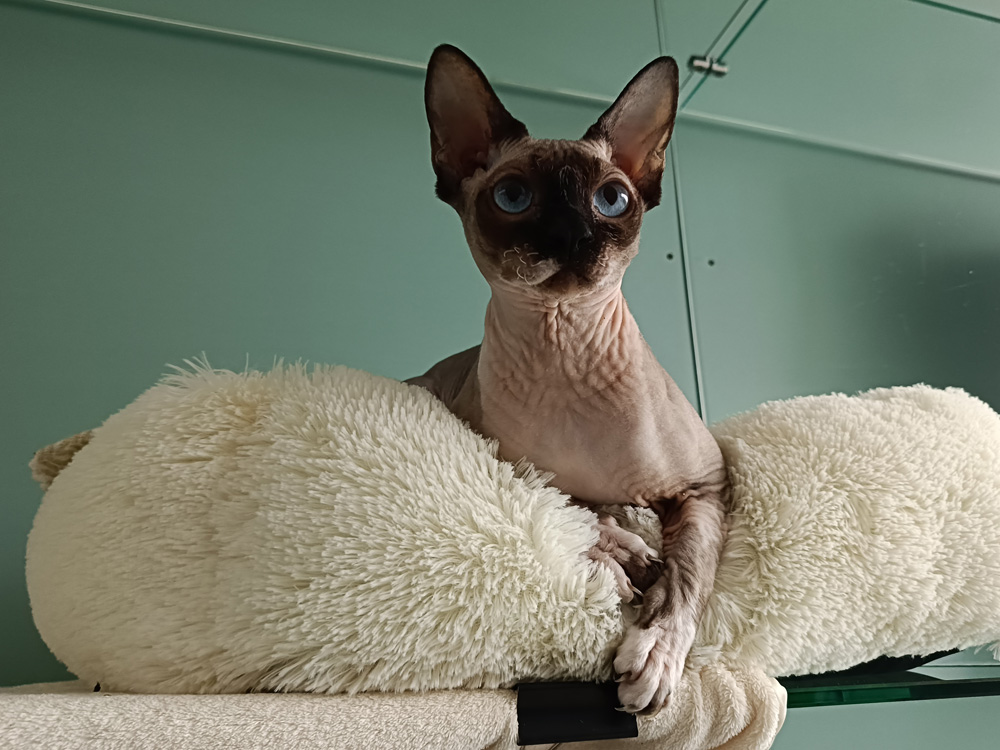 Нашу новую гостью кошечку породы сфинкс звали Буся. Мы заметили весьма любопытную закономерность: то вдруг невероятным образом подавляющее большинство постояльцев в нашей гостинице только чёрные коты, или белые, или рыжие, или мейн-куны, или Пуся-Муся-Куся. Эти невероятные вероятности можно продолжать бесконечно, удивительно, одним словом. В этот раз случилось «нашествие» лысиков, причём совершенно непохожих друг на друга. Буся оказалась не только мега-общительной из всех наших гостей-сфинксов, но и весьма и весьма активной кошечкой. Убирали мы в номере у Буси с Бусей на голове, нашей голове. Худенькая, ладенькая и мускулистая Буся с легкостью запрыгивала на спину, «закреплялась-хваталась» своими цепкими лапками и просто обмурлыкивала нас со всех сторон. Терлась, ластилась и всячески демонстрировала кото-дружелюбие. Очень игривая, прыгучая, словно кото-обезьянка, Буся постоянно что-то двигала, пробовала на зуб и коготь, постоянно любопытничала, встречала-провожала котопостояльцев и их владельцев, практически не сидела на одном месте. А с чудесной масочкой на мордочке, огромными прозрачными нежно-голубыми глазами, ушами-бабочками – очаровательная Буся была бесподобна!