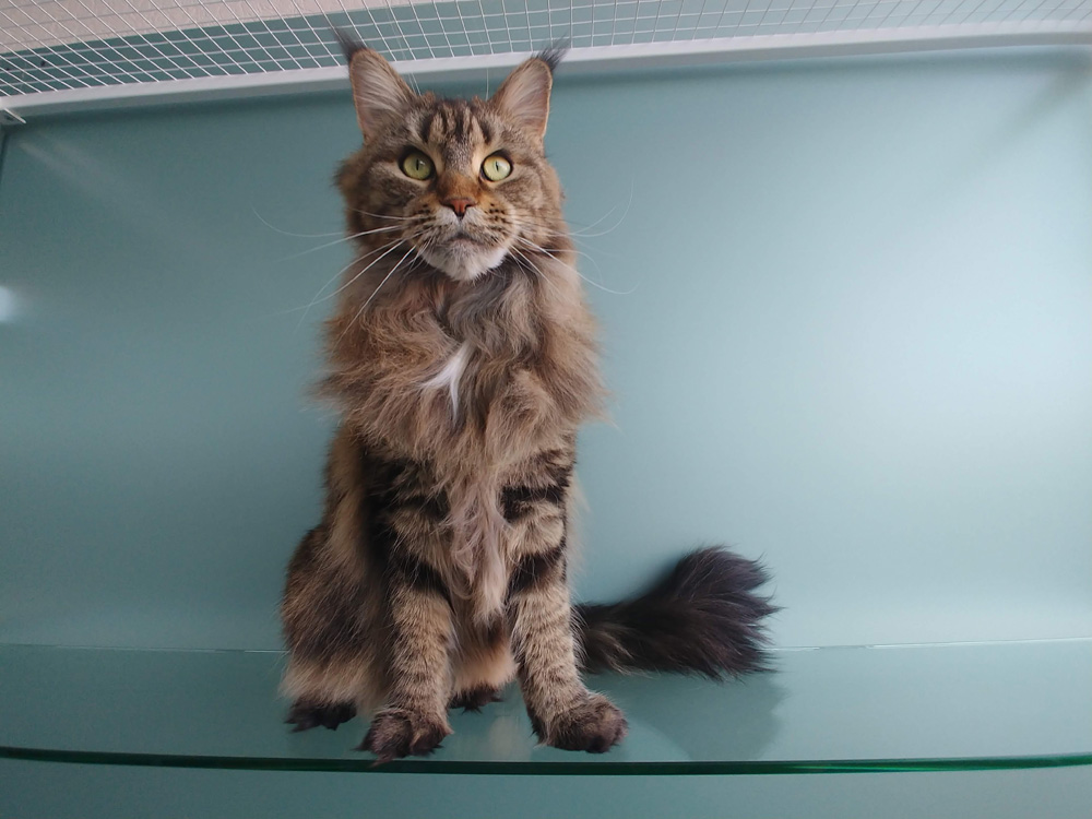 Кошечка Гера породы мейнкун с потрясающим окрасом – черный мрамор в теплом коричневом тоне, который ещё называют «мрамор на золоте», даже на любителей «непушистых» кошачьих пород типа сфинксов, ориенталов и абиссинцев, производила неизгладимое впечатление. При виде Геры все посетители нашей гостиницы без исключения ахали и всплескивали руками. Королева! При этом никакого кошачьего королевского высокомерия со стороны Геры мы не заметили. С самого начала пребывания у нас кошечка Гера с нами была мила, сама инициировала наши отношения, деликатно дала понять, что готова к обнимашкам и с удовольствием посидит на ручках. Совершенно не злоупотребляла нашим вниманием, не требовала к себе особого отношения, была очаровательной, мурчливой и ласковой девочкой, даже когда мы, вооружившись щётками и расчёсками, чесали её пышные штанишки и Герин животик. Можно отметить, что Гера - первый мейнкун в нашей гостинице – любитель кошачьих парикмахерских услуг; обычно вся процедура расчесывания «хорошо одетого» мейнкуна как раз на животе-то и заканчивалась бурным протестом. В случае с Герой мы в очередной раз убедились, что хорошо воспитанная кошка – это бесконечная радость и океан удовольствия!