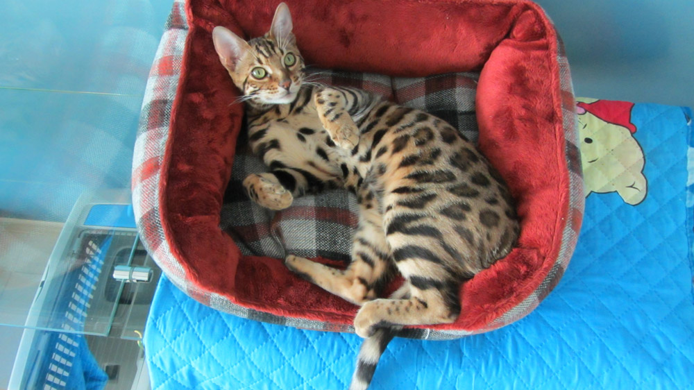 Безусловный красавец Хич: с зелеными глазами; с мягкой золотистой шерсткой с бенгальским узором, статный и грациозный… вау, сказали мы! Бенгалы дружелюбны и добры, хорошо относятся к людям, активны, общительны… и любопытны - это по Хича, а еще они большие болтушки и любители расплёскивать воду. И это тоже про Хича. Как только Хич поселился в нашей гостинице, он тщательно обследовал свой номер: проверил крепость решеток, высоту полочек и надежность двери, попробовал «достучаться» до соседей, погонял свои мячики, бантики и мышки, обжился так сказать. По своему опыту мы, конечно, знали, что бенгальские коты весьма разговорчивы и отлично различают человеческую речь, но Хич оказался просто необыкновенным болтуном! А еще и любителем все переставлять и двигать: то мисочку в зубах к домику отнесет, то домик к мисочке подвинет! Одним словом, чертенок:)