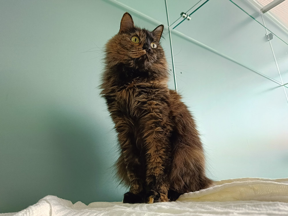 Нашу новую гостью звали очень вкусным и сладким именем Ириска. Молоденькая, дворянской породы в пёстрой пушистой шубке в цветах карамели, с огромными, словно блюдца жёлтыми глазами, Ириска с нами дружить не пожелала. Вернее, почему-то к одной из котонянь была более-менее благосклонна, а к другой - нет, от слова совсем. Надо отметить, что такое явное кото-предпочтение для нас впервые. Мы всегда отмечаем, что мы абсолютно не в претензии, понимаем и принимаем выбор каждой отдельно взятой котоличности. Коты очень избирательны и мы никогда не настаиваем на общении; если постоялец не хочет с нами общаться и проявляет негативные эмоции, мы набираемся терпения, просто ждём, даём время ему адаптироваться в новых условиях, принять новые обстоятельства и, в том числе, нас. Как правило, в подавляющем большинстве случаев «диалог» налаживается, консенсус находится! Поэтому спокойно ждём, не торопим события, создаём атмосферу безопасности и комфорта - заслуживаем одобрение суверенного пушистика! Но встречаются и такие крепкие «орешки»», как Ириска :)