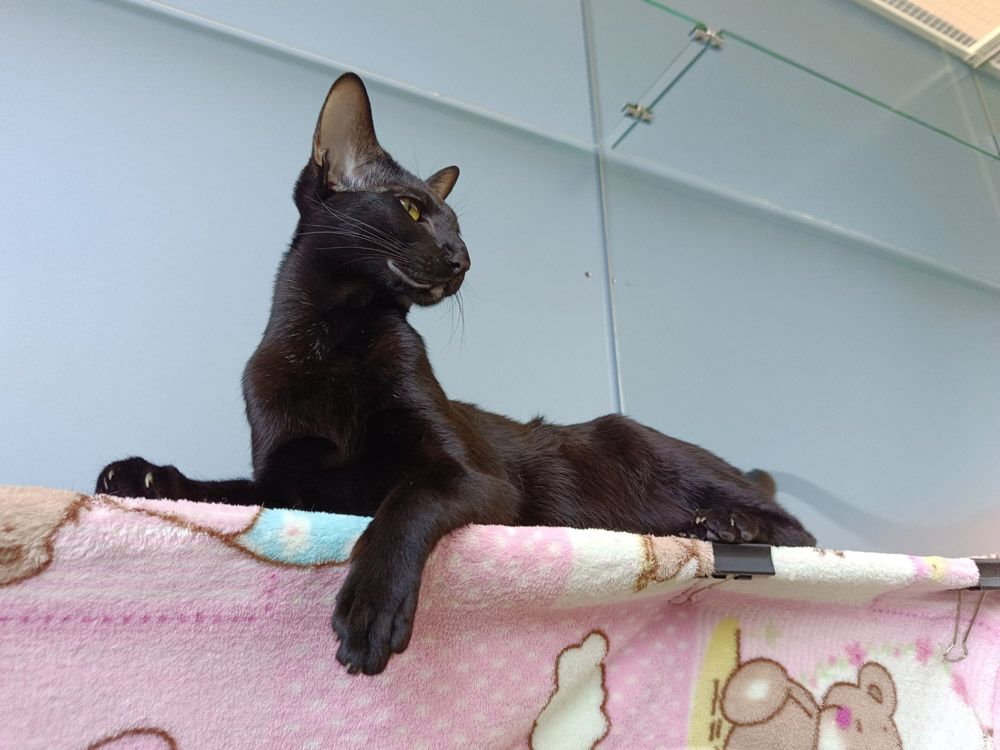 Нашу новую гостью ориентальную кошечку цвета «эбони» звали Камра. Само имя уже подразумевало что-то необычное и волшебно-фантастическое: на арабском Камра означает «лунный свет», а на санскрите – «красивая». Молодая кошечка выглядела очень привлекательно и необыкновенно загадочно, в чём мы впоследствии убедились сами. Лёжа неподвижно на полочке в изящной позе, Камра была похожа на угольную эбеновую статуэтку маленькой пантеры. Блестящая чёрная шёрстка, выдающийся ориентальный нос (носиком его назвать трудно!), огромные уши-бабочки, тонкое стройное поджарое тело, длинный хвост и глаза цвета драгоценного топаза – Камра производила впечатление! А ещё Камра в начале без устали «говорила» и даже «пела» громким скрипучим ориентальным голосом, вполне возможно от недовольства: посадили, закрыли, принудили и всё такое. А может быть привлекала к своей особе внимание? Правда, со временем освоилась, обжилась, так сказать, и монолог плавно перетёк в диалог. К нашему огромному удовольствию, Камра без устали ласкалась, тёрлась и забиралась к нам на ручки и подолгу сидела. Чудесная ориенталочка Камра, милая, активная и игривая, без капельки восточного высокомерия «надменного диванного Будды»:)