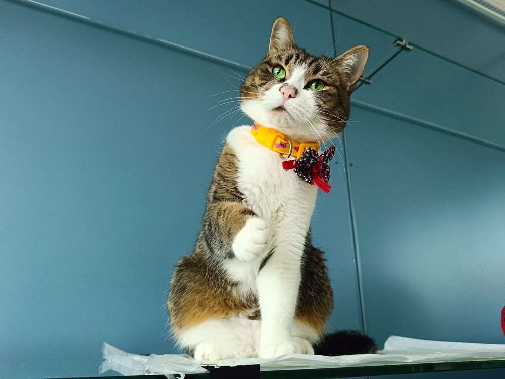 Клеопатра выглядела очень нарядно. Очарования придавала белоснежная масочка на мордочке, переходящая в грудку, пузико, заканчивающаяся асимметрией - абсолютно белой лапкой, причём все остальные лапки были в элегантных белых носочках. Вся эта белоснежная дисгармония контрастировала на фоне мягкой шубки в сочных коричневых цветах. Ярко зелёные глаза и жёлтый ошейник с кокетливым бантиком добавляли прелести и привлекательности хозяйке. С нами Клеопатра была настроена весьма дружелюбно. Демонстрировала своё расположение распушенным хвостом «беличьих размеров», т.е. сдержанности в проявлении чувств явно не проявляла. Но при этом на ручках не сидела, обнимашек хватало на пару минут от силы, не больше, предпочитала выписывать вокруг нас кренделя с восьмерками и тихонечко мурчать :)