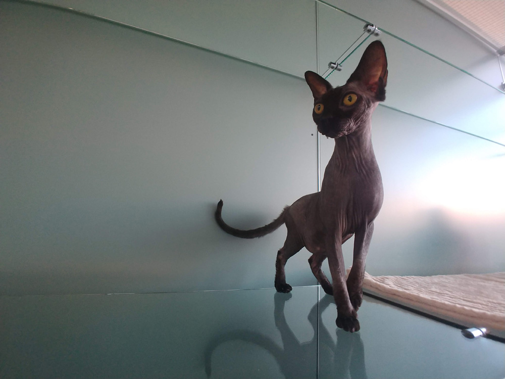 Каждый раз, заходя в номер к Герману и Коже нас встречал нескончаемый поток сфинксовой любви: сдержанная и быстротечная от Германа и экспансивная, бурная от Кожи. Именно Кожа, миниатюрная красавица с удивительными яркими, словно янтарными, глазами, была главной зачинщицей в их с Германом дуэте: побегать, поохотиться за мышкой, «закопаться» в плед и «неожиданно» выскочить – всё это мастерски проделывала эта маленькая шалунья. Также Кожа обожала обнимашки! Залезть на колени к котоняне, страстно поцеловать в ухо, помурчать, спрыгнуть на пол, лечь на спинку, подставляя горячий лысый сфинксовый животик, повертеться, подставляя то один бочек, то другой, и тут же стремглав сорваться с места и снова начать бегать, прыгать и играть!
