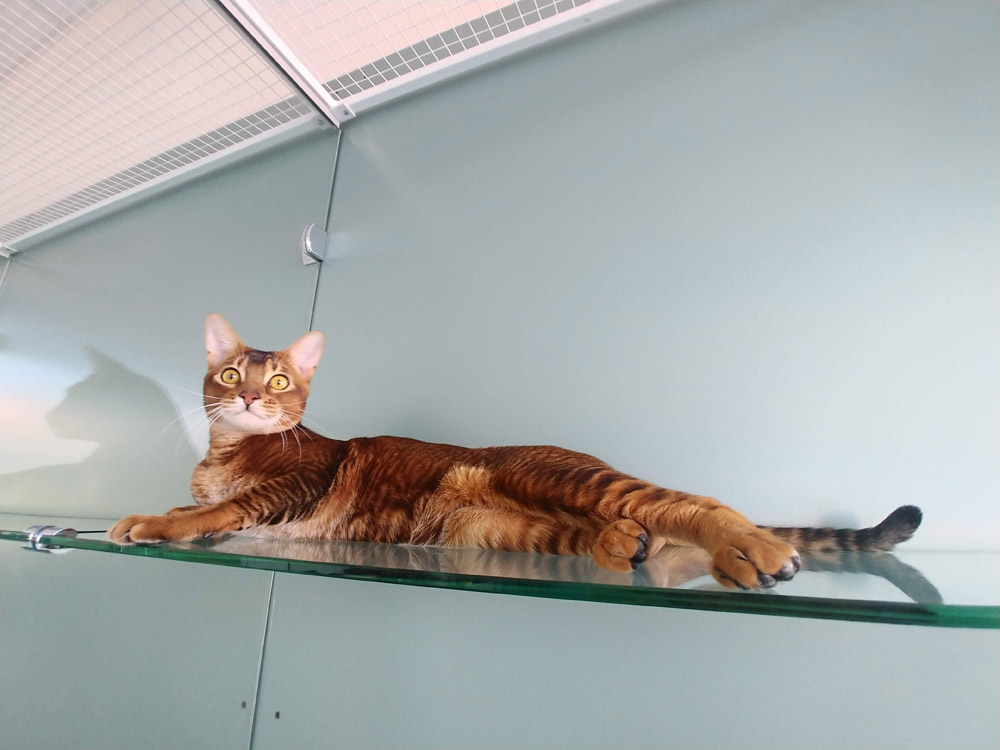 В нашем отеле часто гостят бенгалы и абиссинцы, но именно метиса бенгала и абиссинца до сих пор мы ещё не принимали. Наш новый постоялец по имени Маркус обладал пронзительным взглядом и царственной осанкой абиссинца в сочетании с шикарной шкуркой с полосочками на хвосте и лапах; видимо, так необычно выразилось родство с бенгалами. Элегантный, очень пластичный, с развитой мускулатурой, другими словами, красавец в маму-папу, Маркус «приобрел» и абиссинскую энергичность, подвижность, прыгучесть, и бенгальскую манерность и любопытство, а ещё знаменитую бенгальскую разговорчивость. Про разговорчивость бенгалов наслышаны все. В случае с Маркусом, нам и нашим соседям «повезло» только потому, что сосед самого Маркуса скоттиш-фолд Пьер – большой флегматик, и в прямом переносном смысле, был не склонен к диалогу и, тем более, к выразительному маркусову монологу в частности. Поэтому постепенно монологи Маркуса, не найдя котоподдержки и котослушателей, сошли на нет. Но своё вынужденное молчание, недовысказанность и всю котонедоговоренность Маркус «добирал» энергичными перекусами, забегами, прыжками и невероятным очарованием :)