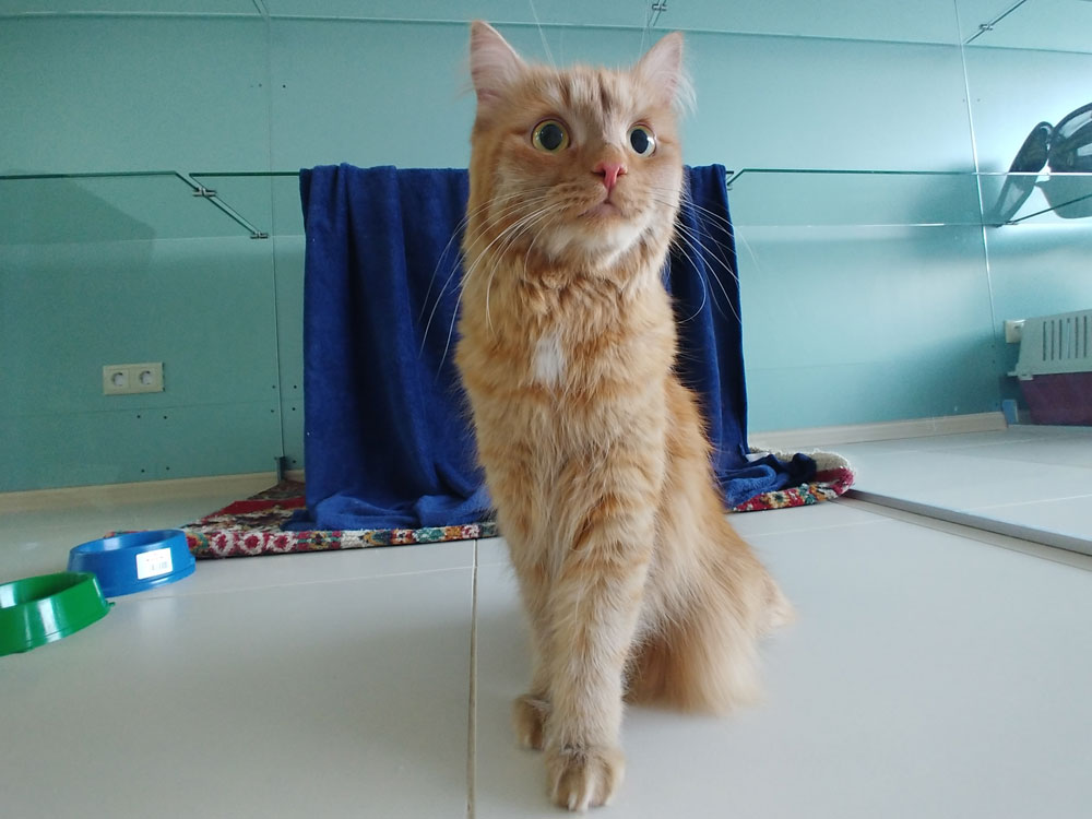 Чудесная рыженькая кошечка по имени Мася напоминала нам скорее пугливую белочку, такой беззащитной и хрупкой она выглядела. Огромные круглые глазки, аккуратный розовый носик, пушистый хвостик и желание поскорее куда-нибудь спрятаться. Мы всегда предупреждаем владельцев наших постояльцев, что их любимцы в первые несколько дней адаптируются к новым условиям, привыкают и осваиваются. Конечно, бывают котики – этакие бывалые путешественники, которые с самого начала ведут себя «как знаем-бывали-плавали». Кошечка Мася привыкала) сначала тихонечко сидела в своем шалашике, совершая одиночные вылазки к мискам и обратно, но затем постепенно освоилась и осмелела. И вот уже осторожная Мася бесстрашно взбирается на верхнюю полочку, посмотреть оттуда, что вообще вокруг происходит; радостно встречает котоняню, мурчит и даже позирует для фотосессии!
