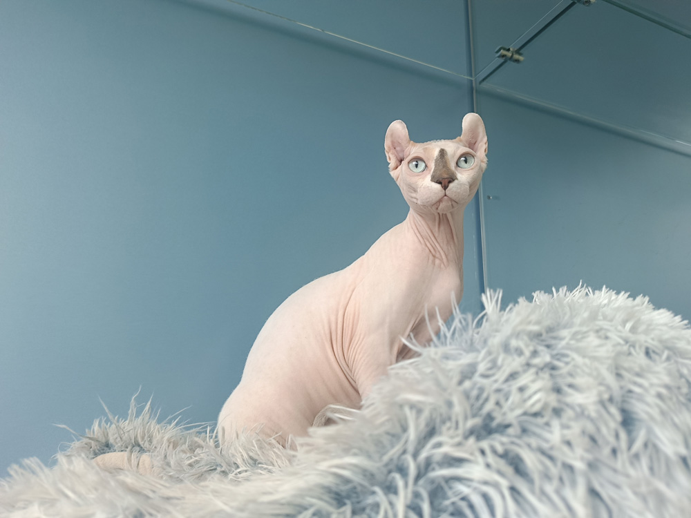 Наша новая гостья - милая и чудесная кошечка породы канадский сфинкс эльф со звучным именем Мелисса, приехала к нам погостить вместе с котиком по имени Марик. Мы уже не раз писали, что всегда пытаемся, наблюдая за нашими кото-гостями, понять, почему их так назвали. Если говорить про мелиссу, как про лекарственную траву, которая помимо аромата, улучшает настроение, снижает тревожность и нервозность, и обладает мягким успокаивающим действием. Активная, игривая и озорная Мелисса ни секундочки не сидела на месте, как гуттаперчевый мячик с эльфийскими ушками скакала и прыгала по номеру и с полки на полку. Со всех лап мчалась к нам на встречу, с нескрываемым удовольствием пристраивалась на ручках, уютно «гнездилась» и ласкалась, при этом вдохновенно мурчала. Очень любопытная и общительная Мелисса постоянно была в движении, про «помощь» в уборке номера, лотка и прочего можно даже и не упоминать - Мелиссин нос был повсюду. Для нас, откровенно говоря, такое поведение сфинкса довольно необычно. Как правило, все наши гости-сфинксы, предпочитают зарыться поглубже в пледы-лежанки, основательно укутаться до состояния кокона, только чтобы нос и уши торчали наружу, периодически устраивают вылазки к мискам, мимоходом могут погладиться, так сказать, отметиться, но и то не всегда. А здесь, такое ураган кото-страстей и эмоций. Кстати, про Мелиссину экзотическую внешность эльфа: вывернутые наружу ушки с загнутыми кончиками, небесно-голубые прозрачные глаза, худощавая, с выразительной координацией, длинными ногами и грациозной шеей – нежная и сказочная непоседа!