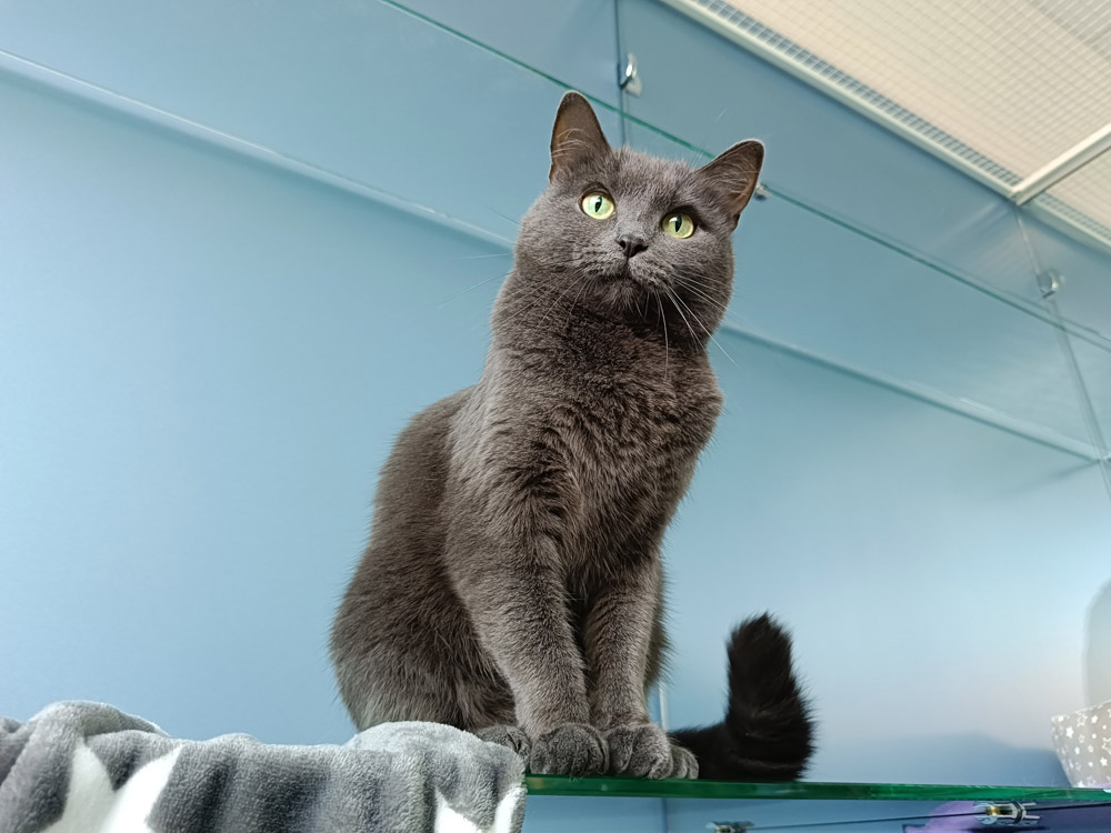 Нашу новую гостью красавицу кошечку дворянской породы звали Мотильда. Если быть объективными, Мотильда приехала к нам в гостиницу уже с повторным визитом, поэтому «не совсем новая гостья» и это не первое знакомство. Но весь фокус с Мотильдой в том, что мы не смогли «поймать» её в объектив камеры во время первого посещения. Мотильда была просто неуловима. Передвигалась по номеру стремительно, ни секундочки не сидела на месте, «позировать» и участвовать в фотосессии отказывалась категорически. Стоило чуть приблизиться, подойти ближе к её номеру, а Мотильда уже несётся со всех лап… к нам на встречу! Тёрлась о ноги, мурлыкала и ласкалась; впрочем, и ласки и все сложно сочинённые котокомпозиции в исполнении Мотильды строго контролировались самой Мотильдой. Все наши инициативы мягонько пресекались. В это посещение фотосессия, наконец, состоялась и Мотильда предстала во всей своей красе. Дворянка небольшого размера, «спортивного» телосложения, гибкая, с длинными лапками и хвостиком, в серой ухоженной шубке, с зелеными глазками цвета молодой травы, изящной мордочкой – такая себе дамочка :)