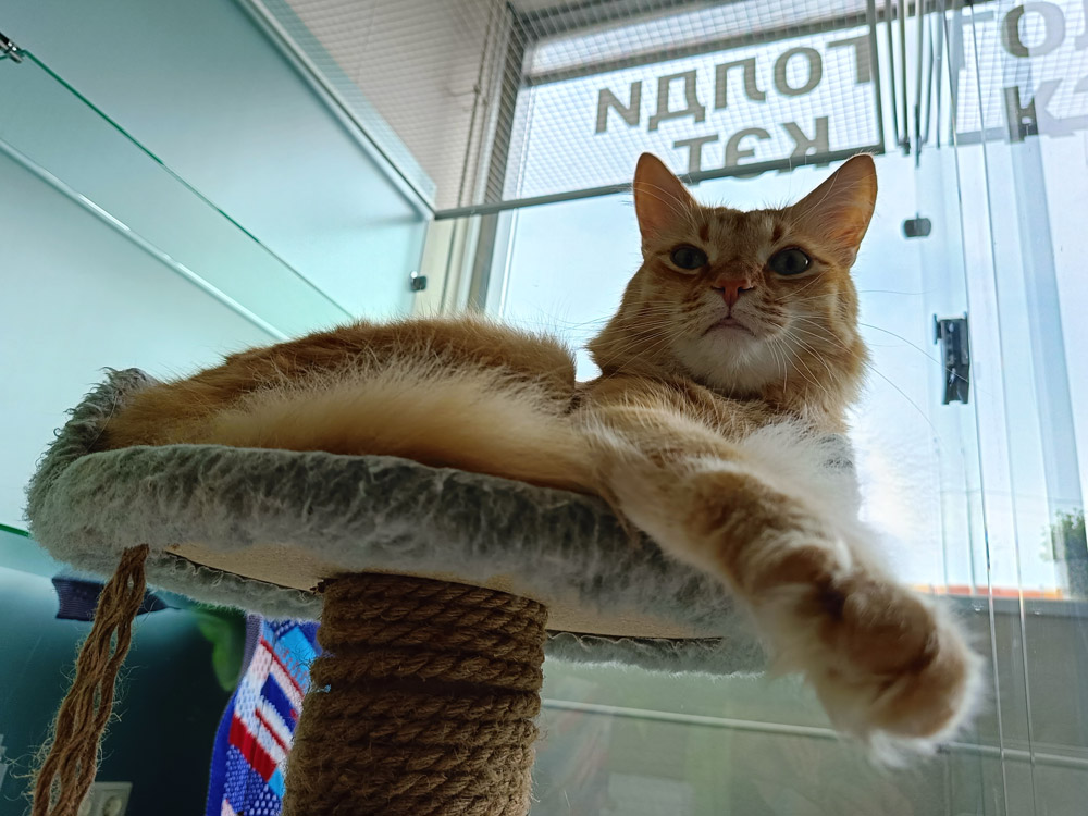 Пара наших новых гостей – рыжий кот Остап и маленькая кошечка Сима. Обычно мы стараемся сфотографировать пару или тройку котиков вместе, сделать «семейное фото в интерьере». Но в этот раз не получилось. Котики не конфликтовали, даже играли вместе, но умилительных котокомбинаций и дружеских объятий мы не заметили; вместе, но в разных концах номера. Остап был старшим в этой кото-паре, скорее именно он задавал тон отношениям. Предпочитал занимать места повыше, полочку или когтеточку, бдел и мониторил обстановку. Более контактным и коммуникабельным в этой паре был именно Остап. Гладиться и ластиться особо не стремился, но расположение и своё кото-дружелюбие выказывал. Милый спокойный домашний кот, думали мы. Но как же мы были, мягко говоря, удивлены, когда только что спокойно лежащий на когтеточке Остап ловко перепрыгнул через котоняню, в прыжке нырнул в чуть приоткрытую дверь номера и рванул исследовать пространство гостиницы. Тот ещё акробатический этюд! Впечатлил, так впечатлил! И когда мы рассказали про цирковой аттракцион владельцу Остапа и Симы, он совершенно не был удивлен. У них дома - это в порядке вещей и удивления не вызывает, что ещё ждать от хитрого рыжего кота :)