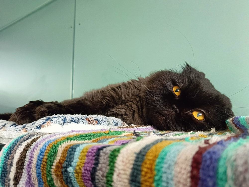 Нашего нового постояльца чёрного шотландского вислоухого котика звали Пусик. Вислоушка Пусик был невероятно мил и элегантен: коротко стриженая шубка, пушистые объемные щёчки, ушки-конвертики, яркие глаза цвета янтаря, миниатюрный чёрный носик и шарик-кисточка на выбритом хвосте! Одним словом, кото-бомба! А плюсом ко всему этому шотландскому кото-очарованию – образец поведения. Дружелюбный, спокойный, воспитанный, абсолютно не навязчивый и …лениво-вальяжный, такой себе домашний кот-кот, любимый и прелюбимый :) Мы Пусика чаще наблюдали в состоянии дзен на полочке, т.е. лежа. Впрочем, как и от подавляющего большинства шотландцев, от Пусика никакой особой физической активностью ожидать не стоило. Пусик предпочитал «давить диван», в смысле, полочку. Всякого рода активности в виде мячиков и мышек игнорировал, как и своих соседей, к слову, проявлял безмерную терпимость. И надо понимать, что совершенно не из-за трусости, скорее по философским соображениям, когда не разумно тратить силы и нервы на бессмысленную и утомительную борьбу :) На ручки к нам Пусик не шёл (а нам так хотелось!), наши возможные тисканья и обнимашки не одобрял, мягко пресекал, и вообще отличался восхитительной невозмутимостью :)