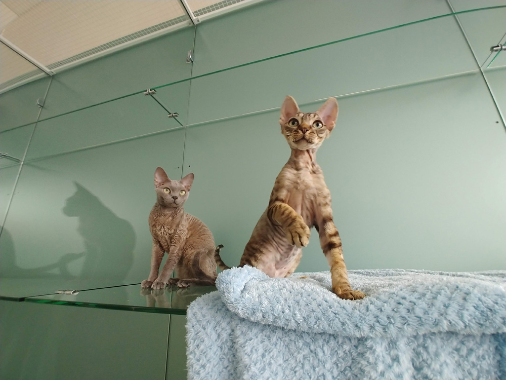 Девонширский кудрявый котенок окраса табби по имени Риччи гостил у нас со старшим «братом» Рэем. Всем известно, что в детстве табби-котята те ещё шалуны и шкодники, чрезвычайно любопытны, капризны и упрямы, все хозяйские воспитательные «лекции» с полнейшим равнодушием игнорируют. А вот прыгать, скакать, активничать, гонять мышки-мячики и пробовать «на зуб» абсолютно всё – это запросто, а ещё громко разговаривать. Недаром говорят, что в девон-рексе сочетается кошка, собака и мартышка. Вполне вероятно, кстати. Игривый, ласковый и дружелюбный Риччи хвостиком следовал за Рэеем: к мискам, лотку, в лежаночку, трогательно сворачивался мягким клубочком рядышком. А «старший брат» оберегал, направлял-воспитывал и терпел, иногда, правда, сбегая от шустрого младшенького на верхнюю полочку, куда котодитя не могло в силу возраста допрыгнуть. Рэй с философским выражением на мордочке сверху взирал на Риччи - безумно обаятельное маленькое существо с повадками обезьянки:)