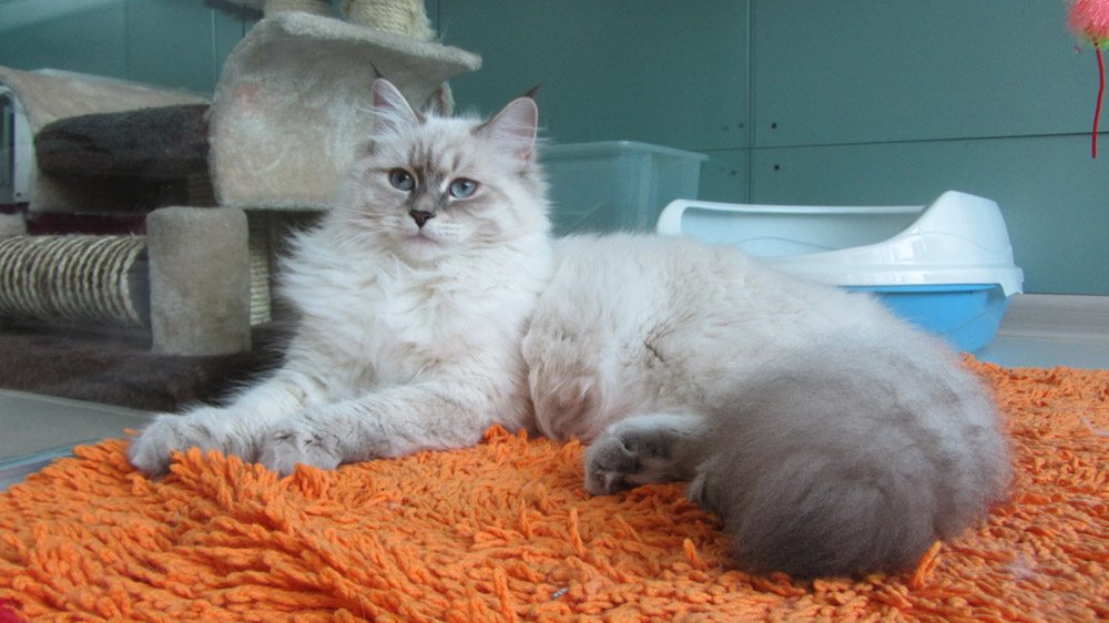 Удивительно, но мы совершенно растерялись в описании своих ощущений при виде кошечки Сири породы невская маскарадная. Безусловная красавица с великолепной карнавальной маской на мордочке и яркими выразительными глазами, Сири представляла собой нечто среднее между мягкой пуховой подушечкой, в которую так приятно уткнуться лицом и обнять, и легким белым облачком, пушистым и практически невесомым. Игривая, подвижная, очень общительная, готовая поддержать любую беседу, мурлыкая и мяукая на все лады с разными интонациями; Сири оказалась и весьма смышлёной кошечкой. Чего стоит Сирин трюк прикинуться котогусеницей! Сообразила, что из номера нельзя выходить, не выпустят, вот и взяла манеру «я здесь просто чуть прилегла», а сама потянется-вытянется и «незаметно» подвинется к заветному выходу, и так словно «гусеничка» шаг за шагом, потягушки за потягушками, пытается «выползти» из номера! Естественно, поймана, естественно, невинный взгляд! А какая «помощница»! Завидит котоняню с щётками и салфетками, игрушки – дела по боку, со всех лап помогать убирать номер и каждый раз с огромным усердием и энтузиазмом!