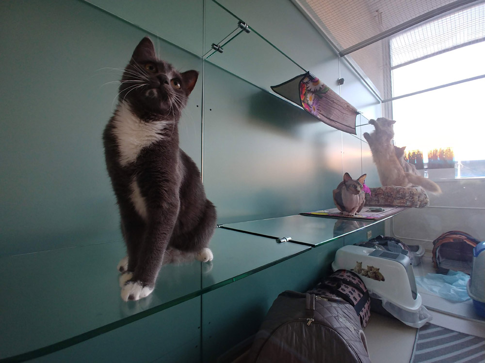 Чудесная кошечка в серенькой шубке с белой манишкой на грудке и белых носочках по имени Туна – сплошной кото-позитив и детская кото-непосредственность. Для маленькой Туны не было ничего невозможного: прыгать выше всех – легко, бегать и играть весь день – запросто! Лишь одно давалось этой непоседе с трудом – усидеть на одном месте больше 10 секунд; нам даже номер приходилось убирать с Туной на руках, так её интересовали наши тряпочки и щёточки! Побыстрее успеть поиграть, повеселиться, побегать, покатать мячики, погонять мышки, пошалить – это про Туну. А котики из других номеров запрыгнут повыше, устроятся поудобнее и вот уже можно смотреть на играющую и гоняющую игрушки по всему номеру Туну и думать «а что этот котёнок удумает дальше?». А мы, глядя на маленькую шалунью, почему-то вспоминали популярный мультик про активную и шаловливую девочку Машу и её заботливого друга Медведя:)